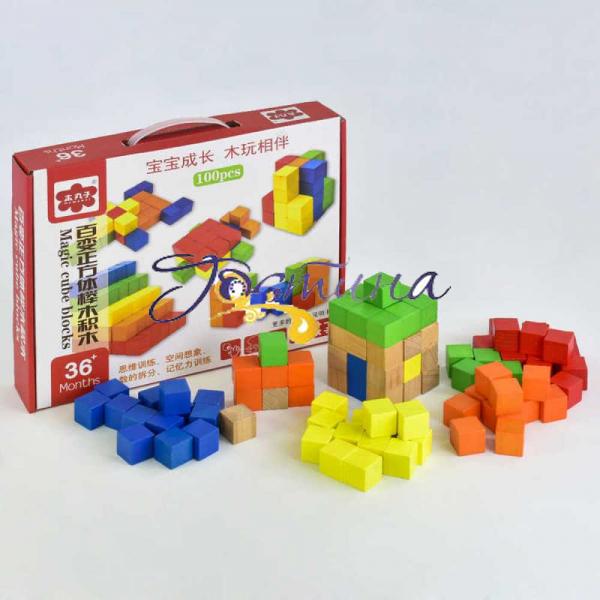 Набір з 100 яскравих дерев'яних кубиків, з яких можна будувати різні цікаві конструкції. Розмір упаковки: 33 см × 7 см × 27 см. Упаковка: Коробка. Для дітей: від 3 років.