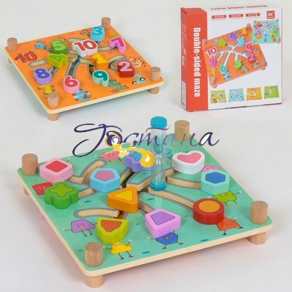 Для ускладнення завдання по сортуванню фігур по лабіринту, в комплекті з лабіринтом йде пісочний годинник. Пересуваючи фігурки в певному порядку, дитина розвиває координацію, окомір, дрібну моторику рук і спостережливість.