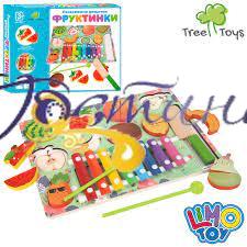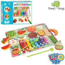 Дерев'яна іграшка навчальна Дошка MD1895 (20шт) 2в1, сортер, фрукти-пазли (на магніті), розрізні, ніж, ксилофон, палички, з аксесс., у коробці 31*24*3см