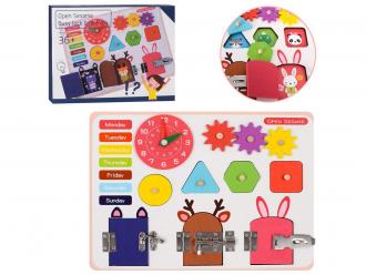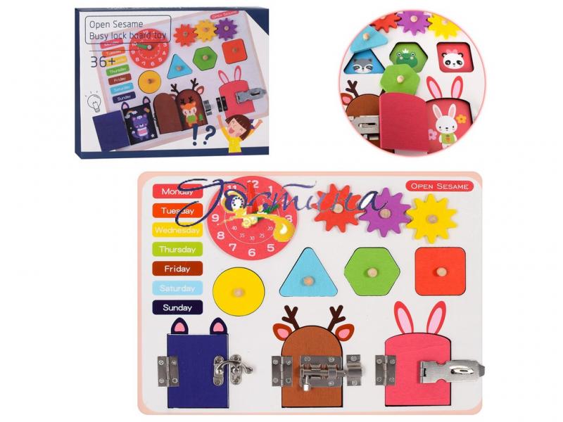 Замочки, двері (відчиняються), годинник, шестерні, рамка-вкладиш з ручкою, дні тижня англійською мовою.