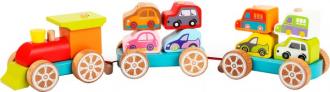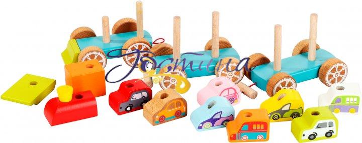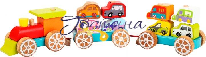 Дерев'яна іграшка Поїзд із машинками складається з 14 деталей різних кольорів, має паротяг, який складається з елементів різної форми й 2 вагонів, на яких розміщені 8 різнобарвних машинок. Машинки треба завантажити у вагони за принципом пірамідки.