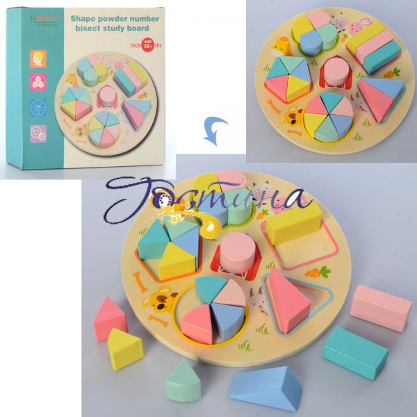 абір "Геометричний" складається з 21 деталі: дерев'яне поле для збору деталей, коло і квадрати, трикутники різної форми, прямокутні бруски. Завдяки цьому набору дитина зможе зібрати такі фігури:
