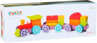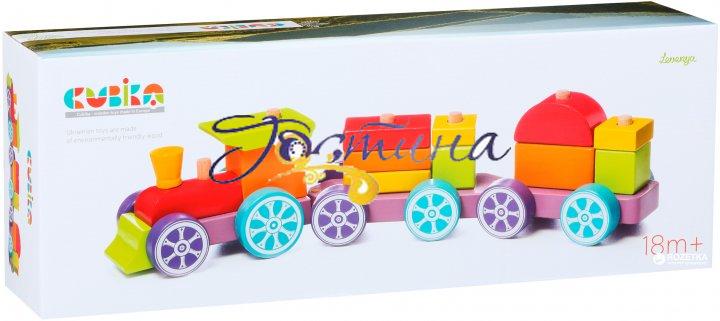 Левеня Cubika Поїзд Веселковий експрес LP-3 15 деталей — набір з дерев'яних елементів, розфарбованих різними кольорами. З цих кубиків дитина зможе скласти великий цікавий поїзд. М'яка колірна гама деталей, приємна на дотик поверхня. Іграшка розвиває дрібну моторику, мислення, сприйняття кольорів, уважність.