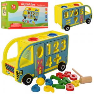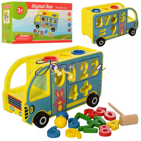 Дерев'яна іграшка Центр розвиваючий MD 2340 автобус 26см, сортер, фігурки-цифри, стукалка, молоточок, кульки 3шт, в кір-ці. Розмір – 26,5-16-11,5см, Матеріал – дерево.