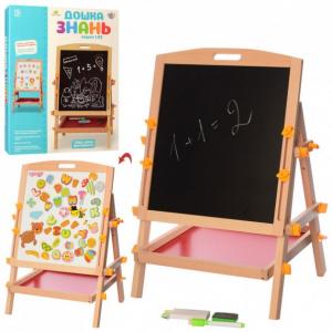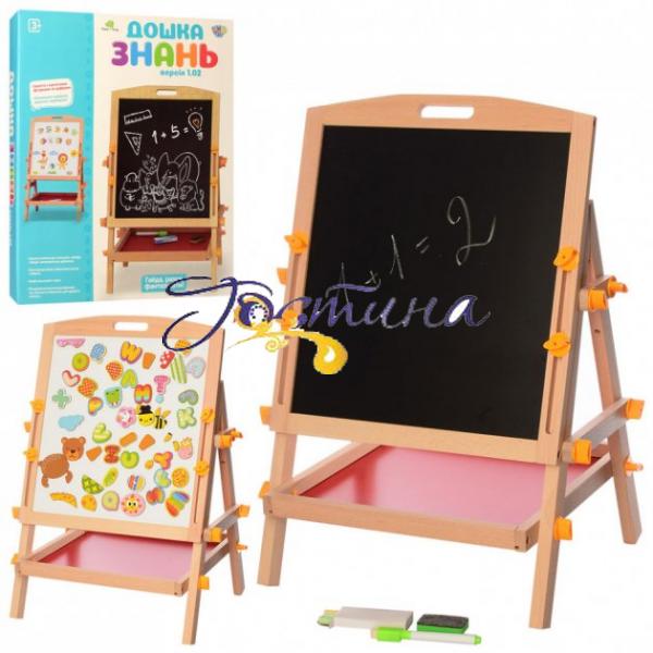 Дошка двостороння (магнітна, для малювання). Має два поля для ігор і творчості - магнітну сторону на яку кріпляться фігурки і можна малювати маркером і крейдяні сторону для малювання крейдою. Виконаний з якісних матеріалів і пофарбований безпечними фарбами. Для зручності використання передбачена ручка для перенесення і можливість регулювання висоти. Під дошкою розташована містка полиця для аксесуарів або канцтоварів. У наборі магнітні фігурки, крейда, маркер, губка. Максимальна висота 74 см Розмір дошки: 34-38 см Габаритна ширина мольберта 39 см Розмір упаковки: 38-45-4 см