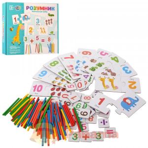 На картках зображені знаки і цифри, їх можна використовувати для складання задачок на віднімання і додавання. Рахункові палички потренують усний рахунок. Вік: від 3 років Матеріал: дерево, картон, пластик Розміри: 25x21,5x4см Комплектація: 50 карток цифр і знаків, 100 паличок для рахунку, 10 пазлів (складаються з двох частин) Виробник: Limo Toy Зроблено в: Китай