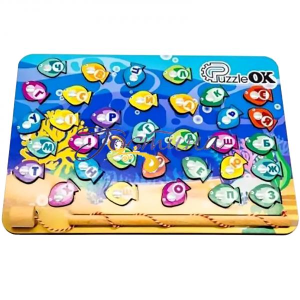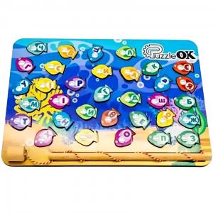 PuzzleOk Риболовля-абетка - це захоплююча гра 2 в 1 для розвитку та навчання вашого малюка з трьох років. Завдяки різним функціям малюк може вивчати алфавіт в ігровій формі. Як грати? Іграшка виконана в яскравому дизайні та оснащена спеціальними магнітами. Легкими рухами дитина ловить кольорових рибок з літерами, повторює їх і вибудовує слова. У комплекті є спеціальна дерев'яна вудка з магнітом, який захований у гачку. Трохи тренування - і молодий рибалок здивує вас своїми новими вміннями. Хто сказав, що рибалка – це нудно? З PuzzleOk все навпаки!
