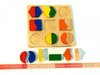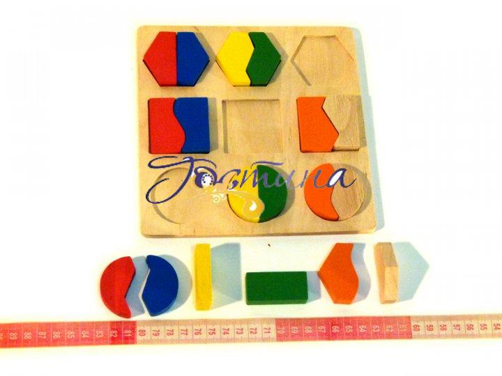 Геометрики з вкладками являють собою інший ігровий процес: "полі" (будь то дощечка, або сторона пластмасового кубика, або частину ігрового центру) з виїмками у формі геометричних фігур і вкладки, які потрібно розкласти у відповідні за формою виїмки на полі. Вкладки бувають у вигляді цілих геометричних фігур і ділених на частини, а також вони пофарбовані в різні кольори. Тому можна сказати, що обидва види геометриков, з точки зору розвивального процесу, об'єднують два пункти: вивчення основних кольорів і цифр (поділені на частини вкладки потрібно вважати, коли дитина їх складає або вже вклав у відповідне місце). Але! Основна "заслуга" геометриков з вкладками в тому, що вони розвивають у дітей цілісність сприйняття предметів, вчать бачити в частинах цілі фігури: коло може складатися з трьох трикутників, квадрат з трьох прямокутників і т. д. Такі геометрики по своїй суті можна назвати першими пазли. Тому, коли батьки говорять, що їхні діти не вміють збирати пазли (але при цьому вільно грають з геометриками-вкладками), це скоріше всього наслідок "остраху" дати дитині в ранньому віці перші "справжні" пазли (починати потрібно з пазлів, де картинка розділена на 2-3 частини) або невдалого вибору пазлів (багато деталей), з якими дитина не впорався і відкинув.