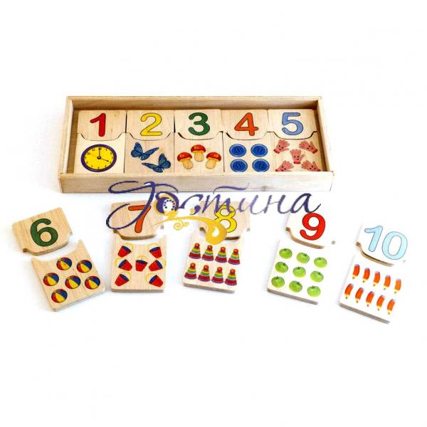 Дерев'яна іграшка "Половинки Цифри" - пізнавальна іграшка, яка знайомить дітей з першими та основними цифрами від 1 до 10. Пазли дають можливість зіставити з одного боку цифру, а з іншого - відповідна їй кількість тварин - так дитині буде легше запам'ятати що цифра "2" символізує два предмети (наприклад, двох метеликів). Також у грі з дерев'яними пазлами-цифрами на допомогу стануть їхня форма: кожна пара пазлів має свою унікальну форму. Іграшка розвиває у дитини сприйняття (форми та кольору), пам'ять (запам'ятовує цифри), логіку (вчить зіставляти цифру з кількістю намальованих тварин).