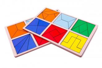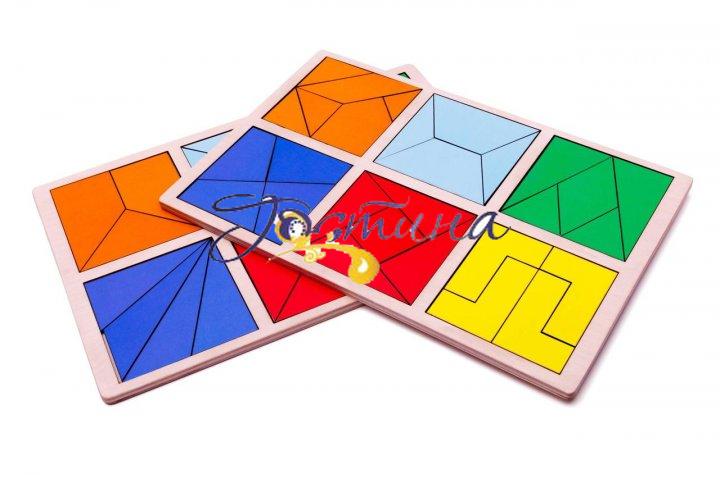 Ця гра виникла з головоломки, в якій вимагалося з кількох шматочків різної форми скласти квадрат. Головоломка була важка навіть для дорослих, але за неї бралися і діти, і безуспішність їх спроб наштовхнула нас на думку зробити низку більш простих завдань, які поступово підведуть до вирішення складного. Отримуючи частини квадрата та завдання “склади квадрат”, малюк виконує кілька видів робіт, неоднакових за змістом та за ступенем складності. Наймолодші починають розуміти, що з частин, іноді дуже дивної форми, можна скласти квадрат. Вони нагадують, що необхідно перевертати всі шматочки на лицьову сторону і відбирати частини за кольором або за відтінками кольорів. Таким чином, відбувається тренування у розвитку кольоровідчуття та кмітливості при вирішенні проблеми частин цілого, їх можливих взаємин та взаєморозташувань. Поступове ускладнення завдань дозволяє дитині просуватися самостійно." "Інтелектуальні ігри". Борис Нікітін.