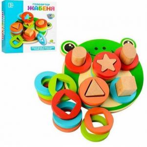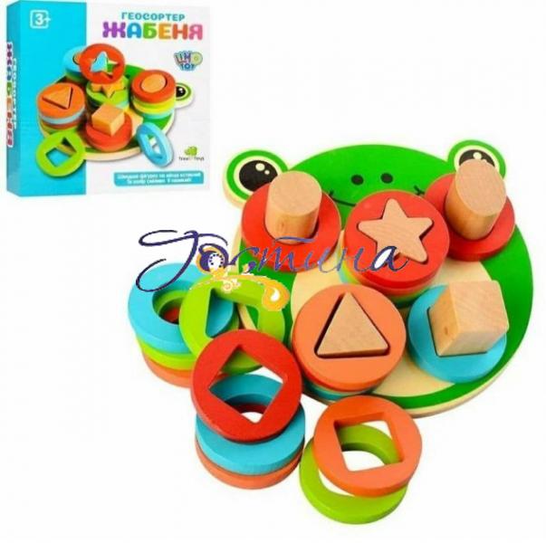 Можливість збирати різноманітні конструкції або сортувати відповідні елементи дерев'яної гри головоломка-сортер Жабка, надовго захопить Вашого малюка.