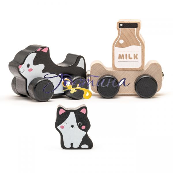 Дерев'яна іграшка Машинка Веселі кошенята від виробника Cubika Дерев'яна розвиваюча іграшка "Веселі кошенята" на магнітах Левеня Cubika складається з машинки-кошеня та причепа з молоком, які кріпляться між собою на магнітах. Завдяки рухомим колесам машинка розвиває високу швидкість і має високу маневреність. Ідеально підходить для малюків, тому що деталі великі, але не важкі та зручні для ручки дитини. Розвиває дрібну моторику, логічне та об'ємне мислення, уяву. Розмір упакування: 9.5x4.5x13.5 см.