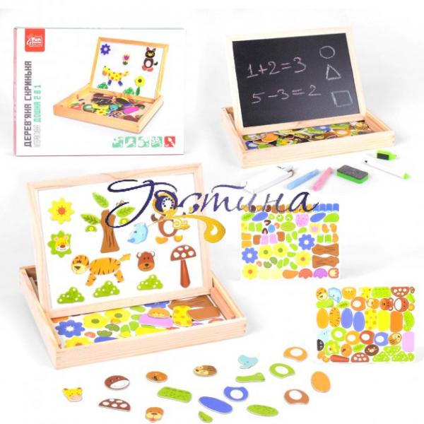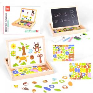 Дерев'яна магнітна дошка 2 в 1 від виробника Kimi - це цілий ігровий комплекс, який не тільки виявляє творчі здібності, а й сприяє розвитку фантазії та логіки малюка. Легка та екологічно чиста коробка виконана з деревини, а дошка надійно фіксується у спеціальних пазах конструкції. З одного боку дошка оснащена магнітно поверхнею і білою дошкою, по якій можна писати сухостираемим маркером, з іншого боку чорне поле для малювання крейдою. У набір входять магнітні пазли, з яких можна зібрати різних тварин і рослин.