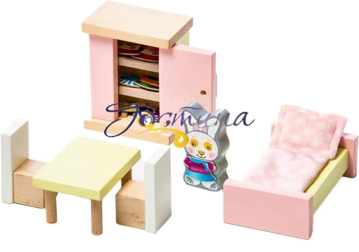 Меблі та фігурка вироблені з натурального дерева покритого безпечною фарбою на водній основі. Прекрасний подарунок для дівчаток від 2 років.