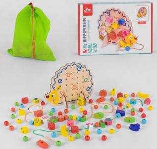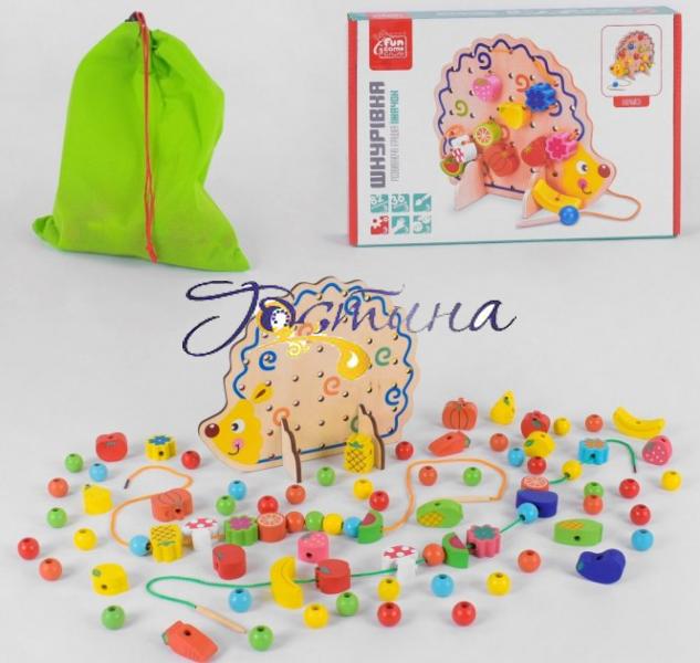Дерев'яна шнурівка Їжачок + Фрукти 82 деталі - веселий їжачок повинен зібрати весь урожай. Малюк буде в захваті. Гра вимагає навичок точності руху пальців, акуратності, ретельності, спритності і навчить розрізняти кольори, розміри, форми.