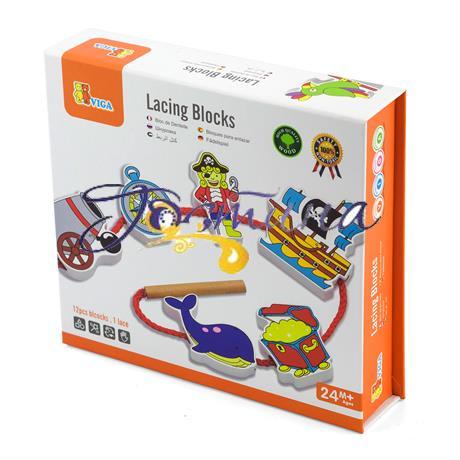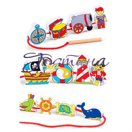 Набір включає 12 дерев'яних фігурок з двостороннім малюнком і шнур з дерев'яним стрижнем. Нанизуючи фігурки на шнур в довільному порядку, дитина розвиває дрібну моторику рук і координацію рук і очей, а кумедна гірлянда, що вийшла в результаті стане для неї веселою іграшкою.
