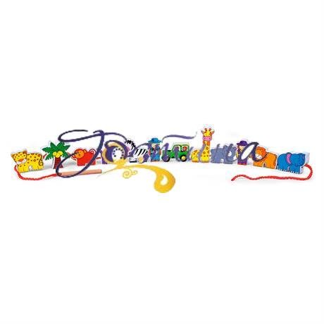 У зібраному вигляді ця розвиваюча іграшка більше нагадує гірлянду. Вона яскрава, багатобарвна, весела. У комплекті шнур із дерев’яним наконечником і 12 фігурок із двостороннім малюнком та отвором для нанизування: пальма, машинка, чоловічок і тварини на будь-який смак – слон і бегемот, тигр і лев, жираф і зебра, ведмідь і мавпочка. Усі елементи ігрового набору виконані з цільного дерева та упаковані в барвисту коробку.