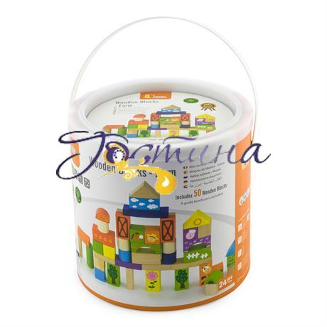 Із кубиками Viga Toys дитина побудує свою першу фортецю, чарівне місто або веселу ферму. Дерев'яні блоки різних форм завтовшки 3 см пофарбовані в яскраві кольори, на кубиках зображені корова, собака, кінь та інші мешканці ферми. Усього в наборі 50 блоків. Кубики від Viga Toys зацікавлять дітей переддошкільного віку від 2 років.
