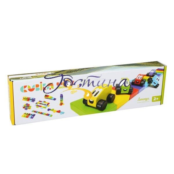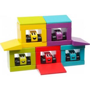 Набір складається з 5 різнокольорових машинок і 31 різнобарвного блоку різної форми.