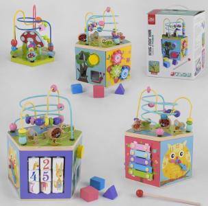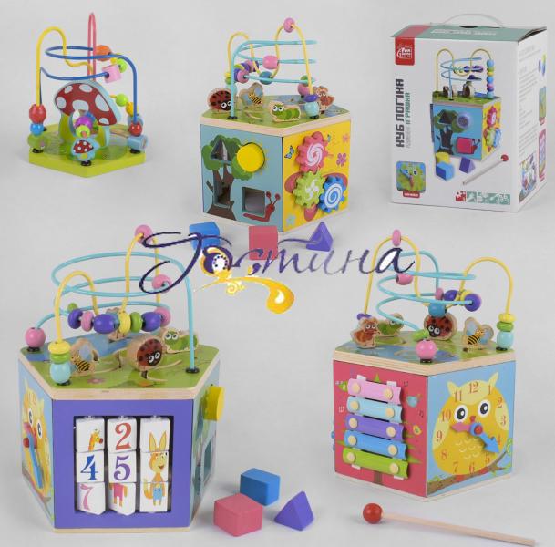 Дерев'яний логічний куб 18515 від Fun Game - це цілий ігровий центр у Вас вдома! На всіх гранях куба встановлені оригінальні ігрові панелі, кожна з яких спрямована на розвиток певних навичок дитини. За допомогою такої іграшки навчання дитини буде не лише швидким, але ще й веселим, яскравим та цікавим! Під час гри малюк зможе вивчати нові форми та кольори, тренувати дрібну моторику, логіку та уяву! Багатофункціональний куб включає: - пальчиковий лабіринт; - сортер; - ксилофон; - Дерев'яний лабіринт; - циферблат годинника з стрілками, що обертаються; - шестерні, що обертаються; - обертові кубики із зображеннями тварин та цифр.