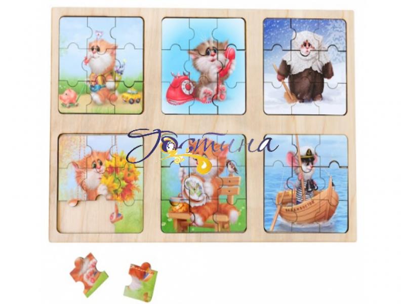 Дерев'яний пазл Ань-Янь 6 в 1 Котики та мишеня зацікавить дитину та забезпечить веселе, повне приємних емоцій дозвілля. Зберіть картинки, де зображені кумедні котики та мишки. У наборі 9 картинок-пазлів з намальованими звірятками та основа розміром 33 х 22 см. Матеріал виготовлення: якісна деревина. Гра з пазлом Ань-Янь розвиває творчі здібності, дрібну моторику, поняття частини та цілого, а також уяву. Рекомендовано для дітей віком від 3-х років.