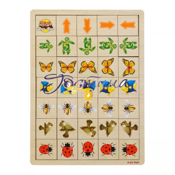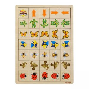 Планшет-основа, на якому розміщені: 6 плашок зі схематичними зображеннями предметів, 4 плашки зі стрілками та 24 плашки для сортування. Дитині необхідно розмістити предмет у потрібній графіці в зазначеному положенні (відповідно до напрямку стрілок). Наприклад, ось так бджілка летить вгору, а ось так рибка пливе праворуч. Гра для розвитку навичок орієнтування в просторі (вгору, вниз, вправо, вліво), довільно-зразкового сприйняття, уваги