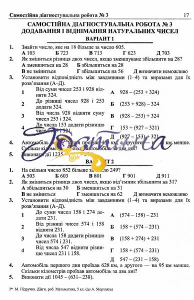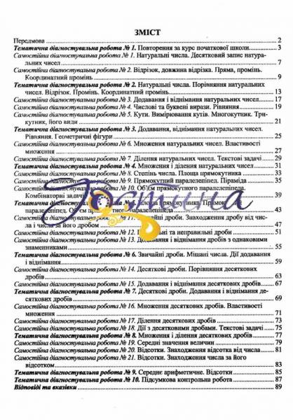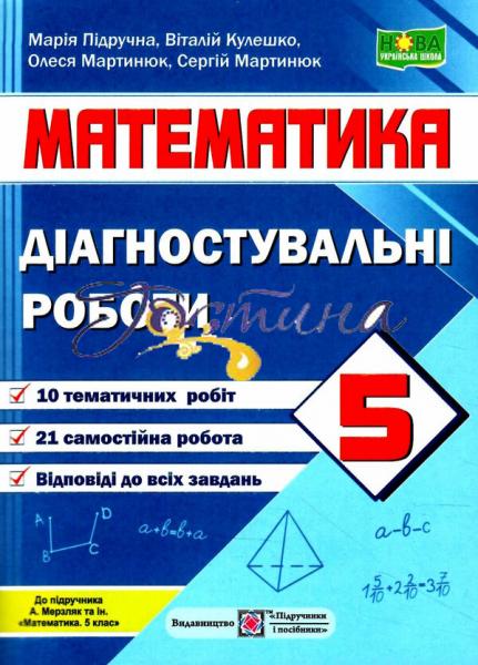 Посібник призначений для діагностування навчальних досягнень учнів 5 класу закладів загальної середньої освіти й містить 10 тематичних діагностувальних і 21 самостійну діагностувальну роботу, які охоплюють усі теми курсу математики 5 класу. Він відповідає модельній навчальній програмі «Математика. 5–6 клас» (авт. : А. Г. Мерзляк та ін.) й підручнику «Математика. 5 клас» (авт. : А. Г. Мерзляк та ін.). Для вчителів математики та учнів 5 класу закладів загальної середньої освіти.