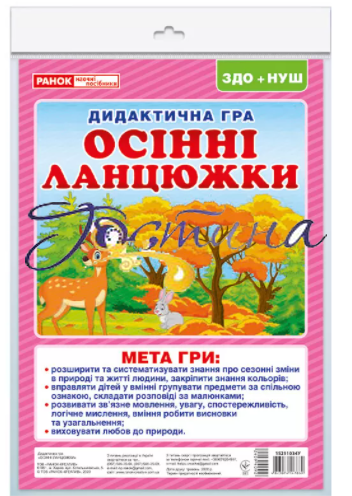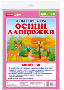 Завдяк дідактічній грі «Осінні ланцюжки» діти навчаюсь групуваті предмети за спільною Ознакою, складаті Розповіді. Гра Підходить для роботи во время тематичних тіжнів про осінь або для позакласна зайняти по Концепції Нуш. Працювати можна як з групами дітей (початкова школа, дитячий садок), так и індивідуально. У наборі 48 карток, зроблений з целюлозного картону и рекомендації до гри. Гра призначила для багаторазове использование.