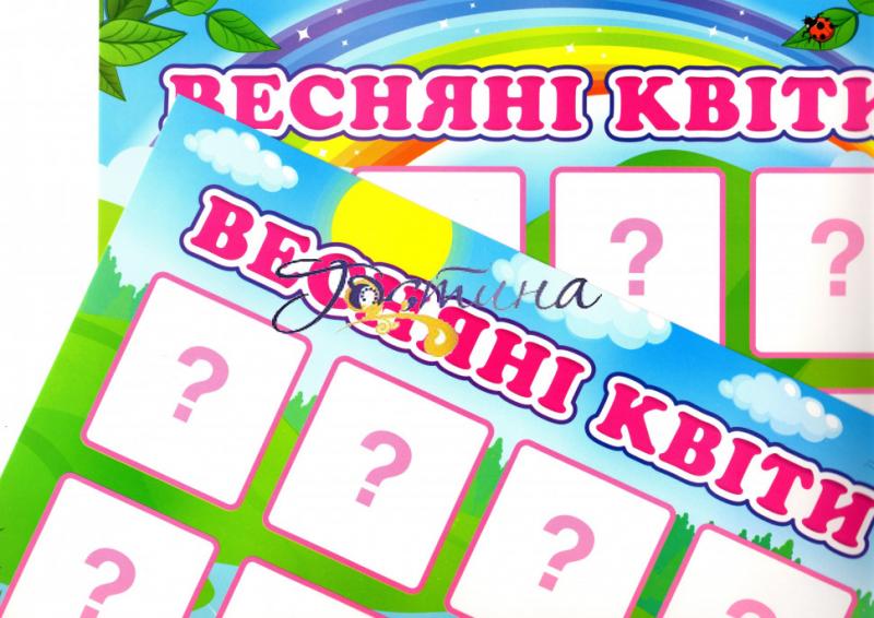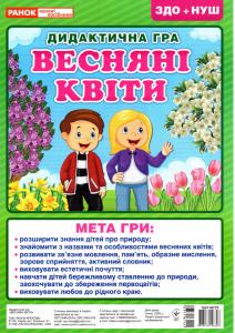 Дидактична гра «Весняні квіти» допомагає вихователям, вчителям, батькам змістовно розказати дитині про квіти: чому не варто рвати та затоптувати квіти, псувати цибулину. Набір складається з 2 полів для гри, 24 карток з зображенням квітів та рекомендації до гри, яка містить загадки. Завданням дитини є вгадати назву квітки, знайти її зображення й викласти на ігрове поле. Гра призначена, як для роботи з групою дітей, так і з однією дитиною.