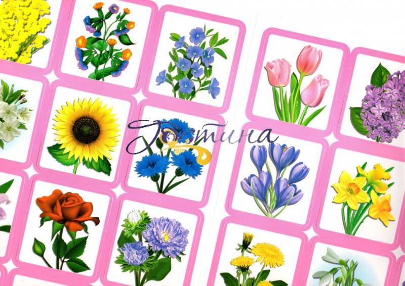 Склад: 2 поля для гри (формат 21х30см), 24 картки з квітами 5,5х6 см, рекомендації до гри.