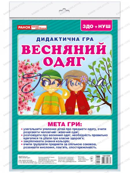 Навчаємо дітей правильно вдягатися та дбати про своє здоров’я через гру. Дидактичний матеріал розроблений для використання під час тематичних тижнів, присвячених весні. Гра підійде як для групової роботи, так і для занять з дитиною вдома. У наборі 2 поля для гри (формат 30х21 см) з глянцевою поверхнею, 24 картки з одягом та аксесуарами й рекомендації та загадки.