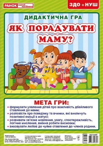 Радувати маму теж треба вміти! Дидактична гра навчить не тільки дбайливо ставитися до матусі, а й дасть цінні поради, як викликати у найдорожчої людини позитивні емоції. Використовуйте гру під час тематичних тижнів про родину, на виховних годинах або вдома для самостійних занять. У складі: велике глянцеве ігрове поле (формат 21х30 см), 24 картки та рекомендації до гри.