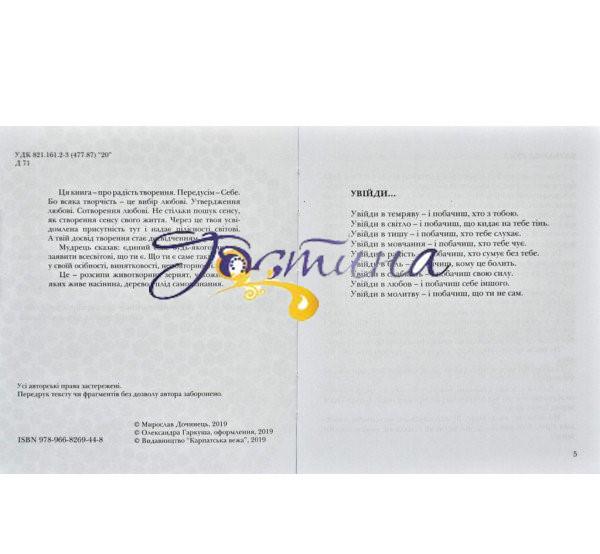 Ця книга – про радість творення. Передусім – Себе. Бо всяка творчість – це вибір любові. Утвердження любові. Сотворення любові. Не стільки пошук сенсу, як створення сенсу свого життя. Через це твоя усвідомлена присутність тут і надає цілісності світові. А твій досвід творення стає досвідченням душі. Мудрець сказав: єдиний сенс будь-якого чину – заявити всесвітові, що ти є. Що ти є саме такий. Єдин у своїй осібності, винятковості, неповторності. Це – розсипи животворних зернят, у кожному з яких живе насінина, дерево і плід самопізнання.