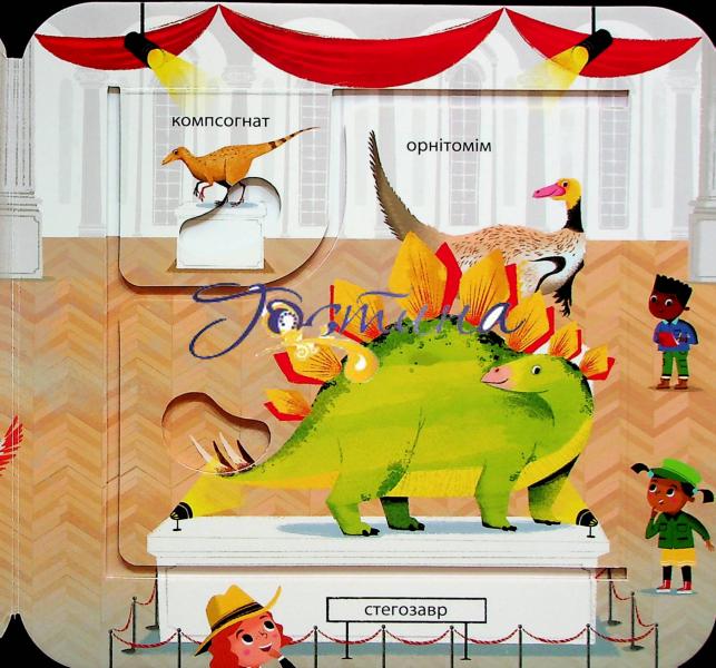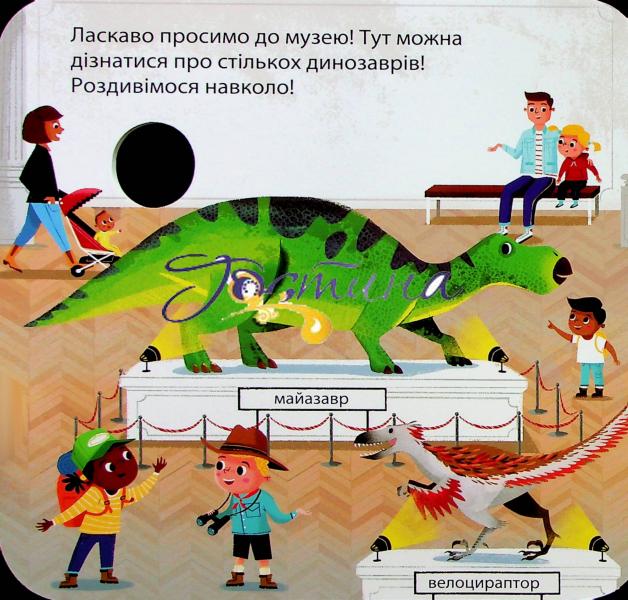 Маленькі допитливі читачі подорожуватимуть багатьма картинками на тему динозаврів, включно з музейними експонатами, природними місцями існування юрського періоду та місцями активних розкопок динозаврів.