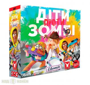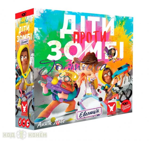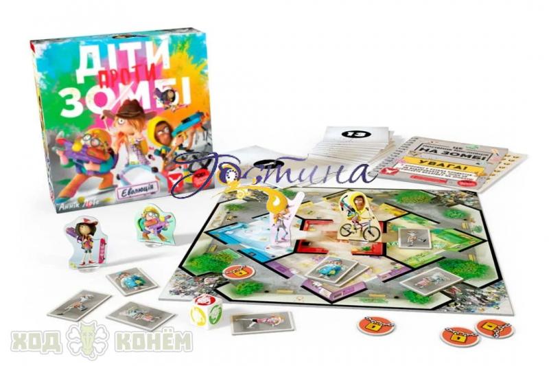 Настільна гра «Діти проти зомби» - це чудова дитяча настілка з механікою легасі, яка точно не змусить нудьгувати! У цій грі юні гравці стануть шкільними героями, які даватимуть відсіч зомбі, які увірвалися до школи, рятуватимуть вчителів та своїх однокласників. Гра розвиватиметься по ходу проходження, з кожною пройденою чи проваленою місією. З'являтимуться нові наклейки, змінюватимуться правила, у персонажів будуть нові здібності, але й вороги ставатимуть сильнішими! Як грати? Щоб пройти місію, гравці мають замкнути жетонами замків усі входи до школи. Учасники ходитимуть по черзі, за годинниковою стрілкою. Дії активного гравця: - кидає кубик зомбі: Зомбі вривається до школи. Гравець бере крайню праву плитку зомбі з ряду і кладе її у приміщення того кольору, що випав на кубику. Якщо випав білий колір – зомбі не додається.