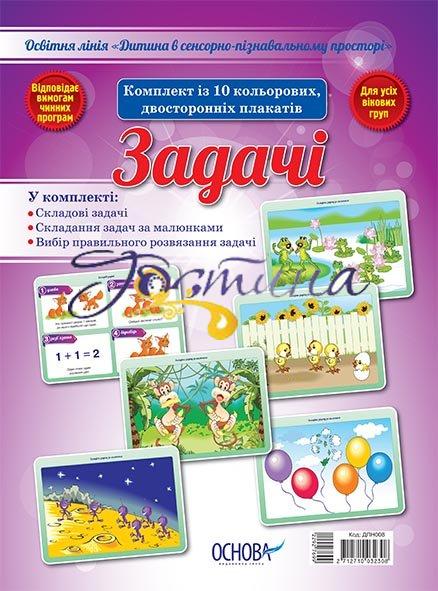 Комплект із 10 кольорових, двосторонніх плакатів.У комплекті:Складові задачіСкладання завдань за малюнкамиВибір правильного розвязання задачі