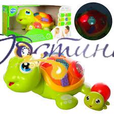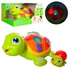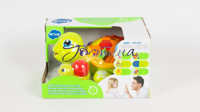 Дві черепашки в наборі: дитинча і батько. Велика черепашка: панцир блимає різнокольоровими вогниками, грає музика, чутні англійські фрази. Звуком можна управляти. Черепашка-батько буде рухатися, якщо посадити малюка на їй спину, якщо вони зіткнутися або за звуковим сигналом. Іграшка розвиває рухові, слухові навички і міжособистісного спілкування. Для роботи потрібні 3 батарейки AA (не в комплекті). Іграшки мають сертифікати якості і безпеки