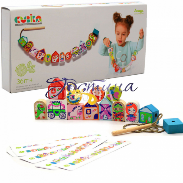 Комплектація - 12 деталей; 8 карток з завданням; шнурок з обмежувачем на кінці і довгою дерев'яною голкою.
