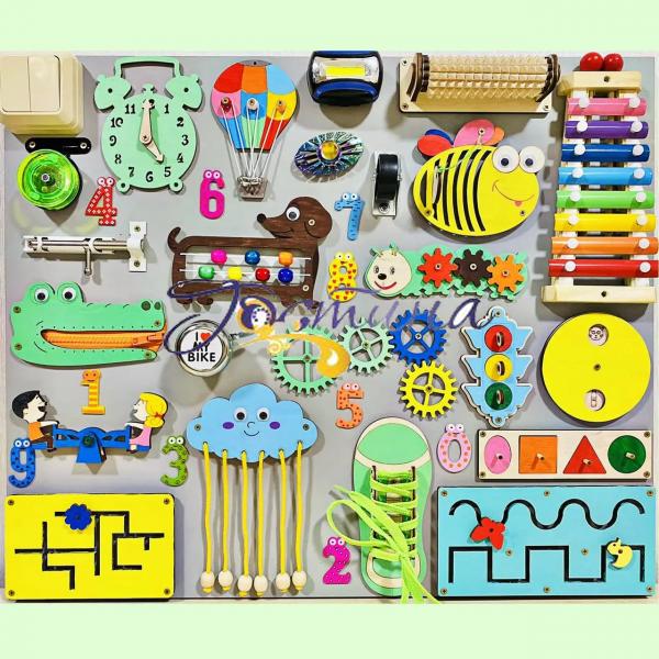 Розвиваюча дошка Бизиборд для малюків - це яскравий ігровий комплекс, який має безліч зон для взаємодії: