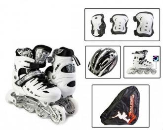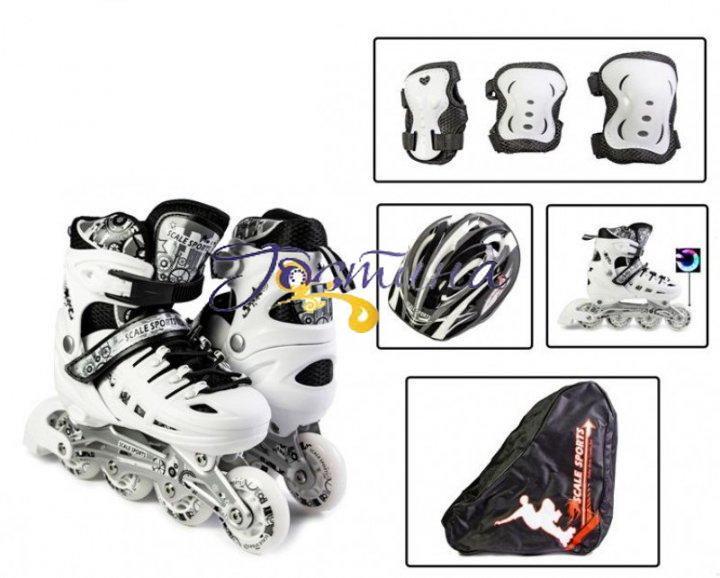 Дитячі Ролики + Шолом + Захист Scale Sport Білий колір розмір 31-34 Комплект "Scale Sport" призначений для тих, хто любить якість та надійність. Купуючи комплекти "Scale Sport", ви одночасно отримуєте одразу цілий набір всіх необхідних елементів: якісні ролики, надійний захист на руки та ноги, а також міцний гарний шолом. Опис та переваги Комплекту "Scale Sport": виріб американської торгової марки "Scale Sport"; зручність застібок та міцне кріплення стопи - шнурівка, бакля AUTОLOCK та п'ятковий ремінь; система гальмування ззаду; поліпропіленова манжета та оболонка - для надійності та зручностей, а також "сітка" - повітропроникність та комфорт; міцна алюмінієва рама; м'який та безшумний хід коліс - підшипники ABEC-7; можливість регулювання на 4 розміри – кнопкова система; РU-колеса з поліуретану (розмір 64-70*24 мм); рівень жорсткості коліс – 82А;
