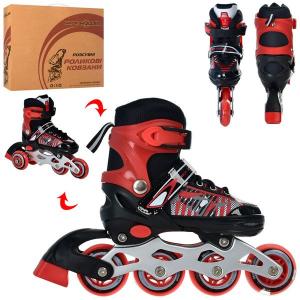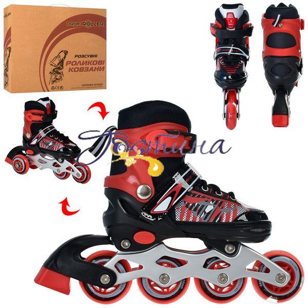 Дитячі роликові ковзани Profi A 4143-XS-R (27-30) Червоні комбо розсувні, колеса ПУ 64мм Особливості дитячих розсувних роликів Profi A 4143-XS-R: роликові ковзани з можливістю регулювання розмірів; можливість регулювання у 4-х розмірах; розмір: 27-30; розмір легко регулюється за допомогою кнопок; устілка 16 см; черевик м'який; мембранна підкладка забезпечує хорошу вентиляцію черевика; зручна застібка-бакля + шнурівка добре фіксують ногу; надійна рама із алюмінію; колеса поліуретанові; переднє колесо світиться комбо, є можливість перестановки коліс - для зовсім початківців можна встановити два колеса ззаду; яскравий сучасний дизайн.