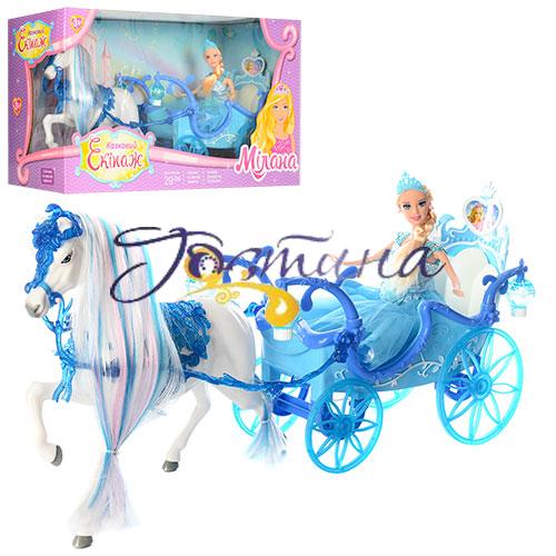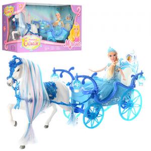 Чудовий ігровий набір для дівчинки ― лялька та карета, запряжена конячкою. Іграшка кінь з каретою оснащена додатковими світловими та звуковими ефектами, що зробить гру ще більш захоплюючою та реалістичною. Лялька виглядає як справжня принцеса: вона одягнена у гарне блакитне плаття.