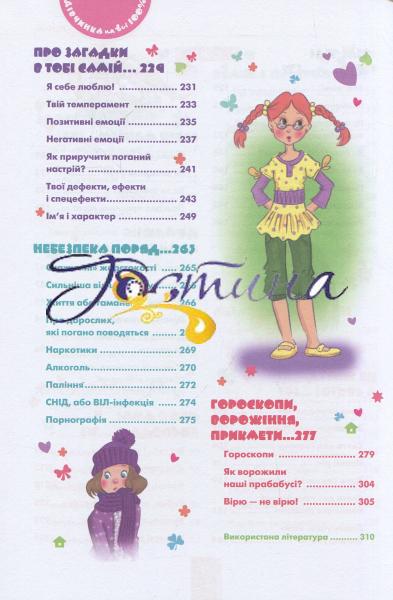 Що цікаво знати дівчинці-підлітку? Як стати впевненою в собі, завжди бути у доброму гуморі, як обирати друзів, без проблем спілкуватися з батьками? Що потрібно робити, щоб стати вихованою, витонченою і, безумовно, привабливою і бажаною у будь-якій компанії? На ці й багато інших питань, пов'язаних із формуванням особистості, дає відповідь ця книга.