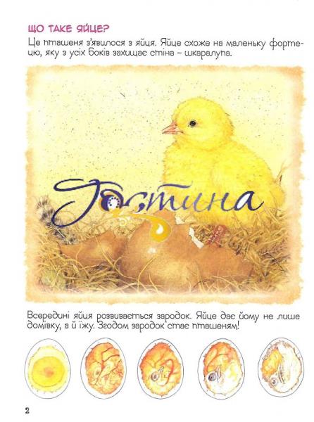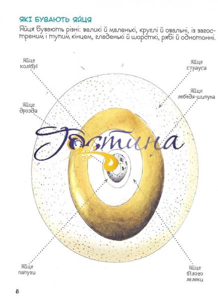 Ця книжка розповість, чому яйце таке важливе для життя різних істот. Дитина дізнається, як воно влаштоване, які тварини відкладають яйця в шкаралупі, а які – у шкіряній оболонці, хто відкладає найбільші, а хто – найменші яйця у світі й чому можна сказати, що люди також з'являються з яйця.