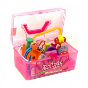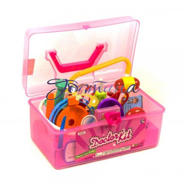 Докторський набір у валізі. У набір входить: стетоскоп з пищалки, стоматологічне дзеркало з підсвічуванням, шприц і термометр з рухомими елементами, молоточок, окуляри, налобний рефлектор, дзеркало (імітація), два скальпеля, ножиці, блюдечко, окуляри, картонна коробочка для ліків, таблиця для перевірки зору і беджіки доктора. Чемодан на на клямці.