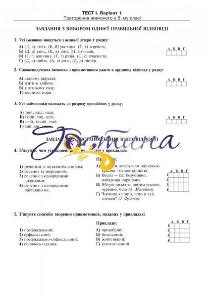 У посібнику запропоновано чотири варіанти тестових завдань з кожної теми курсу «Українська мова» для cьомого класу.