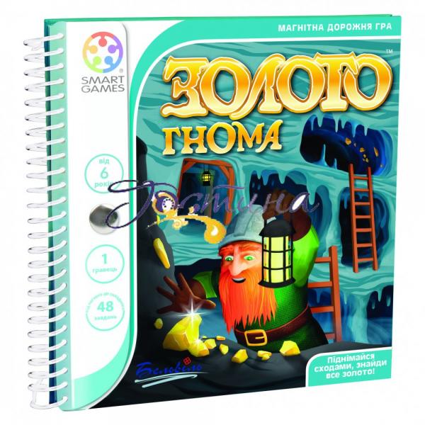 Піднімайся сходами та знайди все золото!“Золото гнома” – магнітна дорожня гра-головоломка, яка містить 48 різних за складністю завдань. Допоможи гному знайти всі золоті злитки, що заховані у копальні. Розмісти 3 деталі з драбинами на ігровому полі так, щоб він зміг рухатися вниз та вгору та зібрати все золото. Вміст коробки: буклет із 48 завданнями та відповідями; складане ігрове поле; 7 прозорих магнітних деталей.