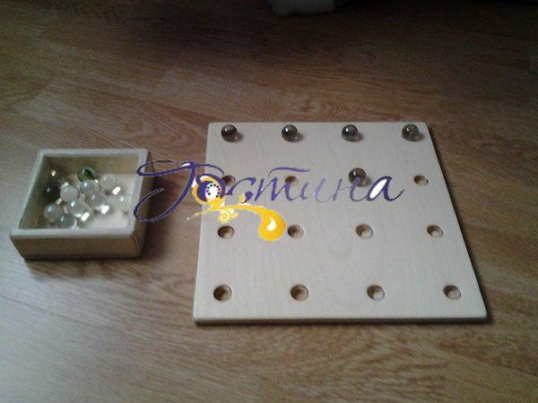 У комплекті дерев'яна дошка квадратної форми з 16 поглибленнями (по 4 в кожному ряду), 16 невеликих скляних кульок, дерев'яна коробочка з кришкою.
