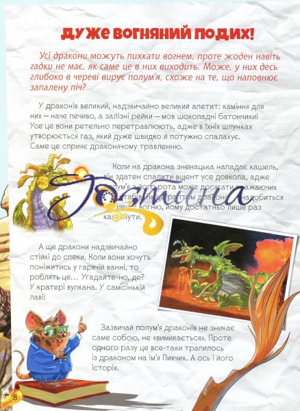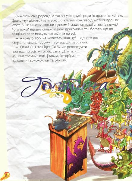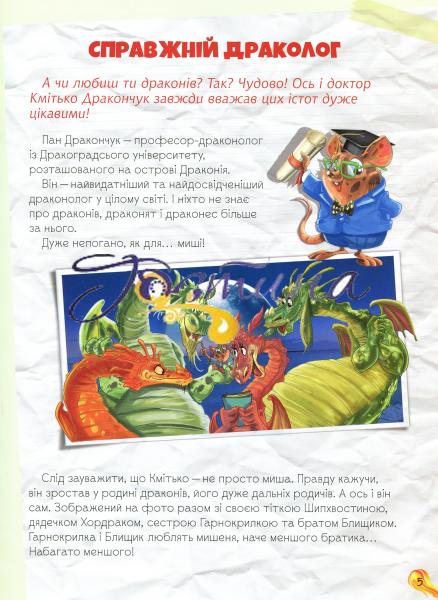 Пориньте в захопливу мандрівку таємничим світом драконів разом із професором Дракончуком. Найвидатніша миша-драконолог у світі познайомить вас із драконами — летючими й наземними, смугастими й картатими, драконесами й дракончиками. Діти дізнаються все найцікавіше про них: де мешкають, чим обожнюють ласувати, як розважаються на дозвіллі. Історії про сильних і розумних вогнедихів не тільки розважать читак, а й навчать бути добрими, чемними, не лінуватися й завжди допомагати одне одному.
