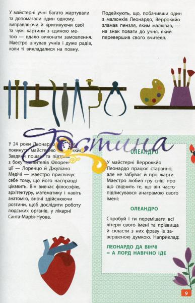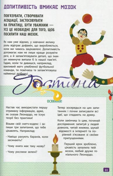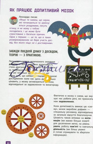 Леонардо да Вінчі — визнаний геній усіх часів. Він досяг успіху в науці, живописі, музиці і навіть кулінарії! Автори цієї книги дослідили біографію та рукописи Леонардо, щоб з’ясувати: як працював мозок майстра. Їхні спостереження супроводжують корисні поради та цікаві завдання, що допоможуть кожному навчитися думати, як флорентійський геній.